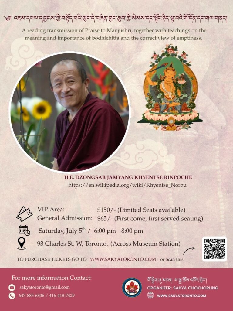 We are pleased to announce that His Eminence Dzongsar Khyentse Rinpoche will be giving a special talk on July 5th , from 7:00 PM to 9:00 PM, at University of Toronto’s Isabel Bader Theatre. This is a rare opportunity to hear directly from one of the most respected contemporary Buddhist teachers. All are welcome to attend. Tickets will be available on a first-come, first-served basis. Please note that seating is limited, and there are very few VIP seats available. We encourage early arrival to secure your spot. For more information, please visit the official event page or contact the organizers directly. This event is in partner with University of Toronto and New College- Buddhism, Psychology and Mental Health Program.